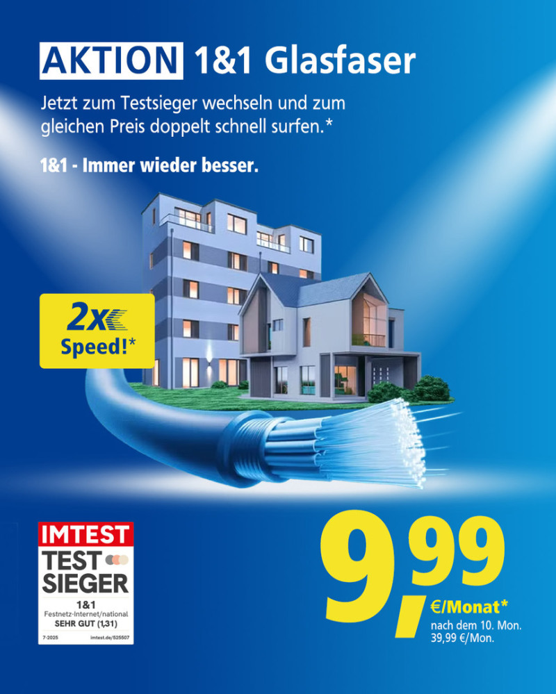 Jetzt 1&1 Glasfaser bestellen und die doppelte Geschwindigkeit zum gleichen Preis bekommen (150 Mbit/s zum Preis von 50 Mbit/s oder 300 Mbit/s zum Preis von 150 Mbit/s).