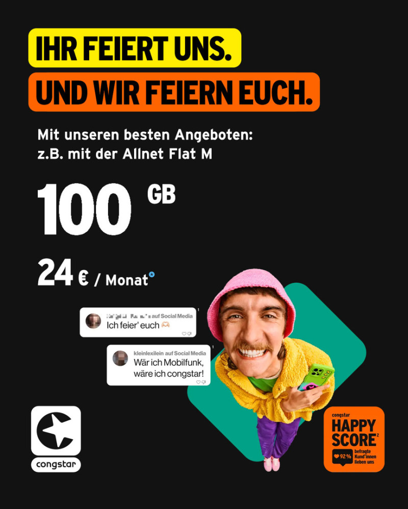 Aktuell bekommt ihr die congstar Allnet Flat M mit GB+ und 100 GB Datenvolumen für nur 24 € mtl.