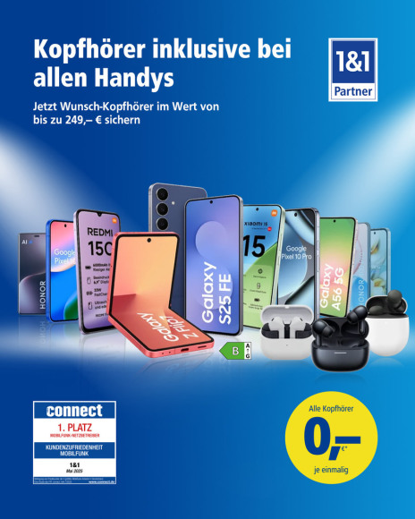 Jetzt ein neues Smartphone in Verbindung mit der 1&1 All-Net-Flat bestellen und die passenden Kopfhörer im Wert von bis zu 249 € dazu bekommen.